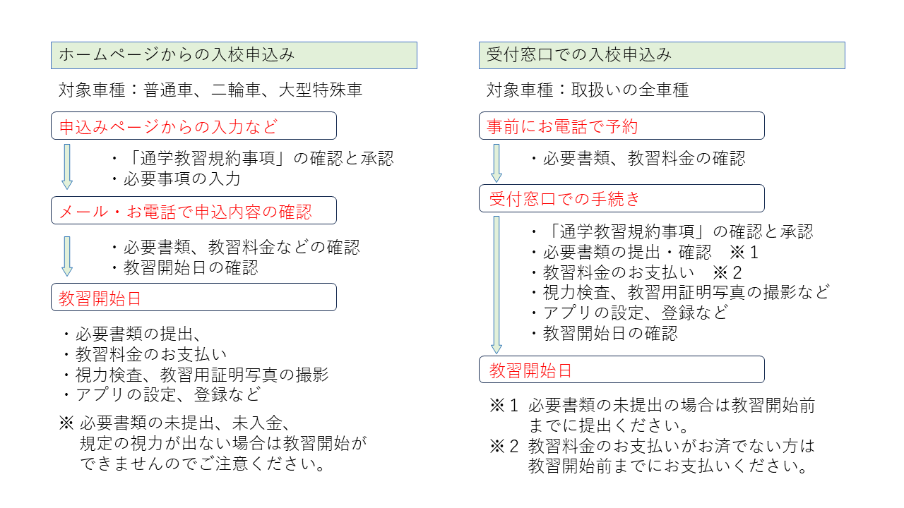 ※必要書類の未提出、既定の視力が出ない方、未入金の場合は教習の開始が出来ませんのでご注意願います。